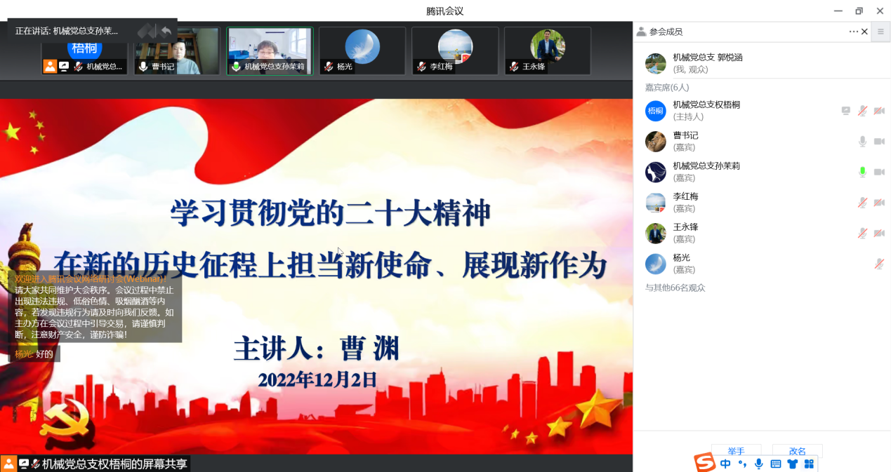 曹渊书记以“学习贯彻党的二十大精神,在新的历史征程上担当新使命、展现新作为”为主题,为党员们讲述了如何理解和把握党的二十大报告的重大历史意义,如何理解“五个牢牢把握”的本质内涵。曹渊书记强调,要认真抓好党的二十大精神的学习贯彻,推动各项工作迈上新台阶。必须把自己摆进去,把职责摆进去,把工作摆进去,要切实把党的二十大精神转化为指导实践推动工作的强大力量,推动党的二十大战略部署转化为务实有效的工作思路、办法举措和具体行动。