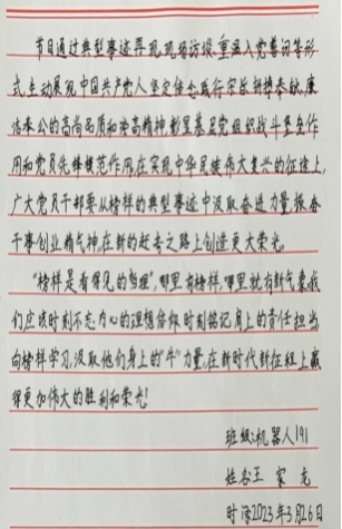本期节目录制了王亚平、王传喜、艾爱国、张玉滚、武大靖、林占熺、孟昆玉、路生梅等8位党的二十大代表的感人事迹。全体教工党员及学生党员高度重视,认真观看专题节目并分享交流。任晓辉同志表示,“十年树木,百年树人,踏上三尺讲台,也就意味着踏上了艰巨而漫长的育人之旅,教师就像那默默奉献的绿叶,时时刻刻衬托着鲜花的娇艳”;赵坤同志表示,“人生的意义不在于索取,而在于奉献,它既表现为在国家和人民需要的关键时刻挺身而出,也融会和渗透在人们日常的工作和生活中”。