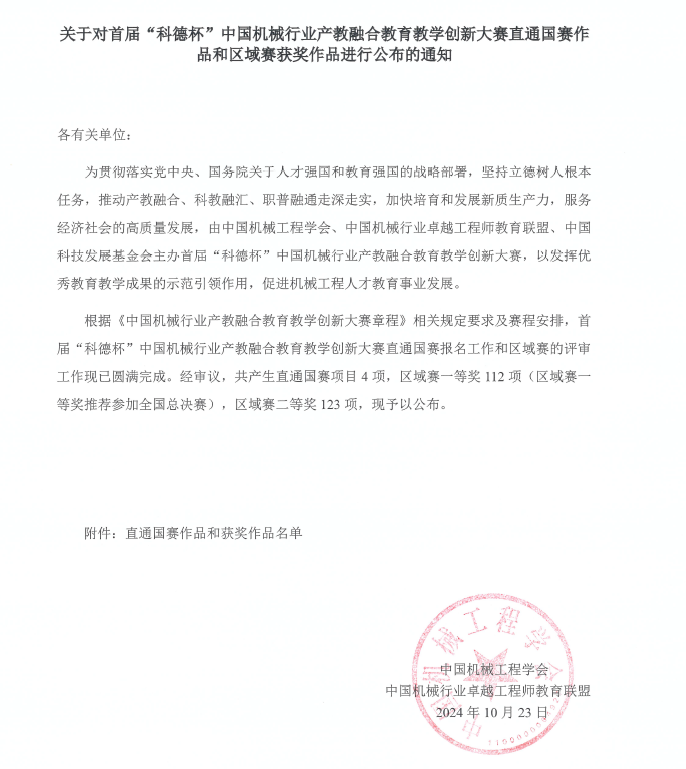 首届中国机械行业产教融合教育教学创新大赛由中国机械工程学会、中国机械行业卓越工程师教育联盟主办,以“教学创新推升高质量育人,产教融合激发新质生产力”为主题,设本科组、研究生组,每组按课程类和体系类赛道分别进行评选。