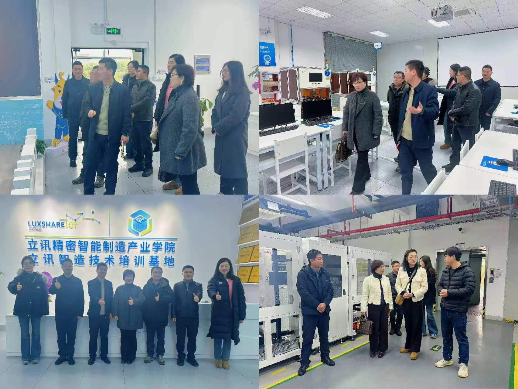 2月14日,双方于立讯精密智能制造产业学院内进行了深入的座谈交流,双方围绕智能制造行业的最新发展趋势、校企合作的新模式探索以及产学研一体化的实践路径等话题,展开了热烈而富有成效的讨论,为未来的深度合作奠定了坚实的基础。交流结束后,孙书记一行在产业学院领导的陪同下,深入企业的实际工作与学习场景,对智能制造实训中心、研发中心等核心区域进行了细致的考察,亲身体验了前沿技术的魅力。